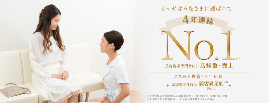 ミュゼは美容脱毛専門サロン店舗数・売上、美容脱毛サロン顧客満足度でNo.1を獲得。
